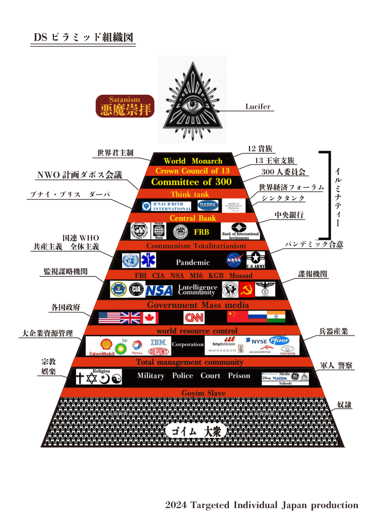我々被害者から言いますと、イルミナティー、フリーメーソン、ユダヤ金融資本課家、300人委員会、モンペルラン教会、ロスチャイルド、ロックフェラー、ビルゲイツ、黒貴族、イエズス会、軍産複合体、医産複合体、闇の政府、闇の支配者等いろいろ言われていますが、